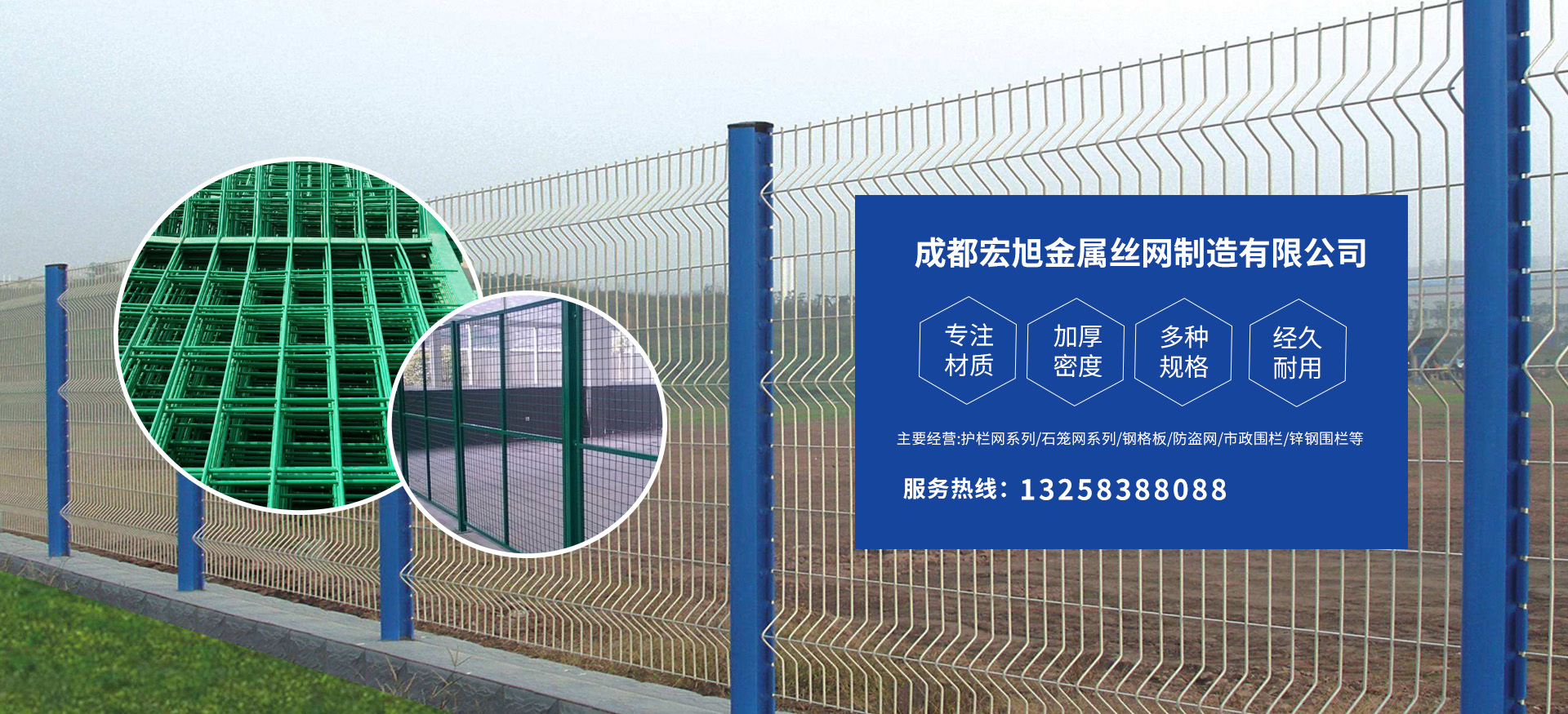 成都宏旭金屬絲網制造有限公司主營護欄網系列、石籠網系列、鋼格板、防盜網、市政圍欄、鋅鋼圍欄、鋼筋網片、聲屏障系列、波形護欄板、柔性纜索護欄、SNS邊坡防護網等其他絲網類產品。特殊規(guī)格可加工定做,也可根據客戶來圖來樣定做。自創業以來,公司一直堅持市場為導向,以客戶為根本,以實業為基礎,以技術為支持,以科研為后盾,集科研、生產、經營為一體,不斷研制開發(fā)新產品,開拓市場,走綜合發(fā)展之路。多年來,公司憑借過硬的質量,良好的信譽、優(yōu)質的服務、合理的價格,贏得了市場和商家的一致好評。